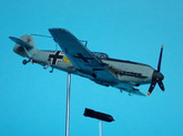The model shows a Messerschmitt Bf 109T-1, dropping a bomb. The T-versions were designed for the aircraft carrier Graf Zeppelin, the project was stopped before it was finished. 70 T-models were built in 1941, only seven of the T-1 and one of them crashed.
